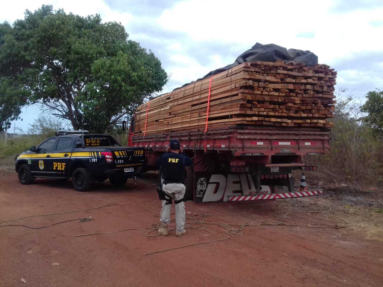 O condutor não possuía documentação legal para transportar produtos de origem florestal. A carga não possuía Documento de Origem Florestal-DOF, nem nota fiscal. Segundo informações do condutor, a carga era proveniente do município de Paragominas-PA e teria como destino final o município de Itapipoca-CE.