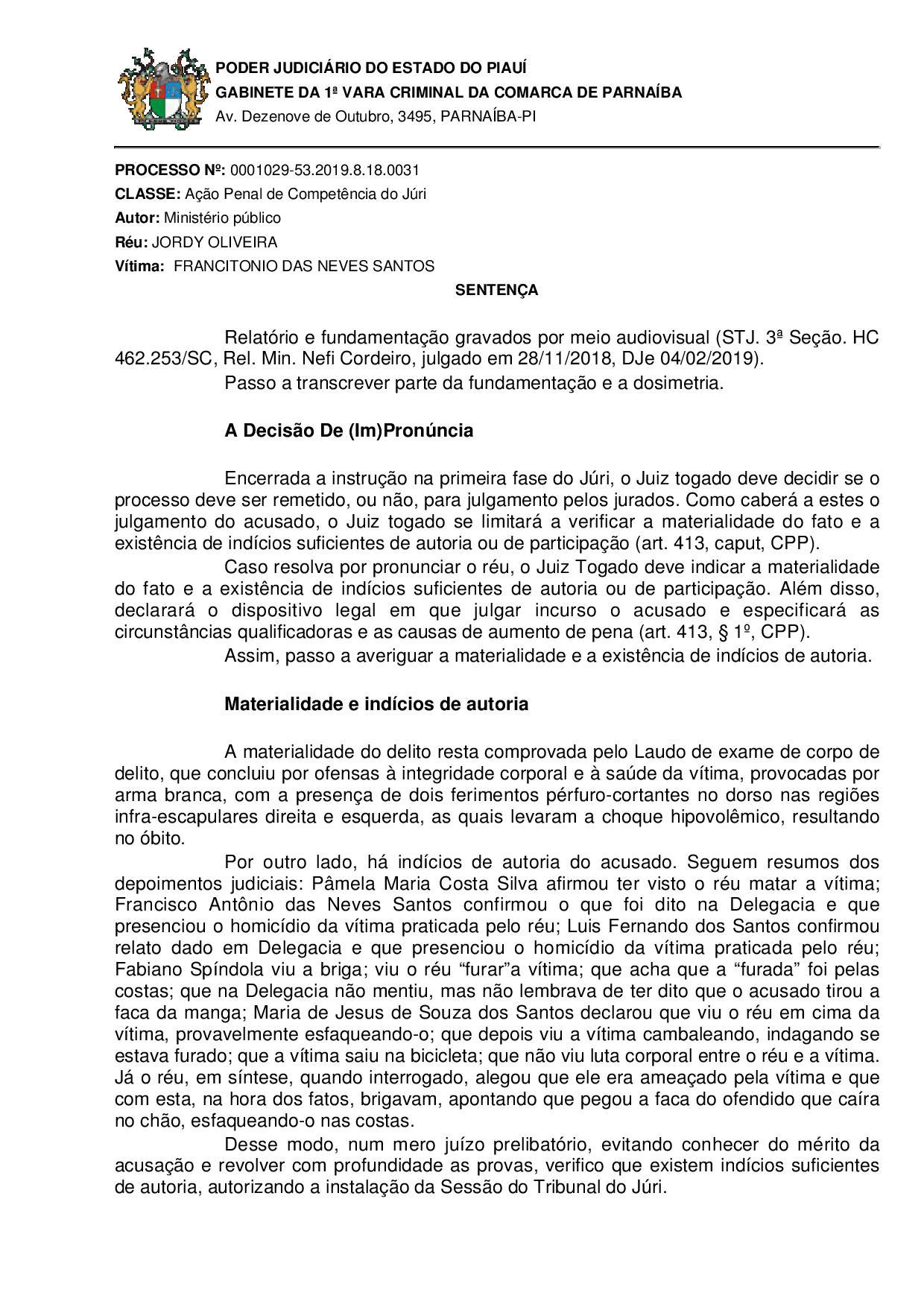 O Tribunal do Júri de Parnaíba irá julgar Jordy Oliveira, acusado de assassinar a facadas o pintor Francitônio das Neves Santos, em maio deste ano. A sentença de pronúncia, prolatada pelo juiz Georges Cobiniano Sousa de Melo, é do dia 02 de outubro de 2019.