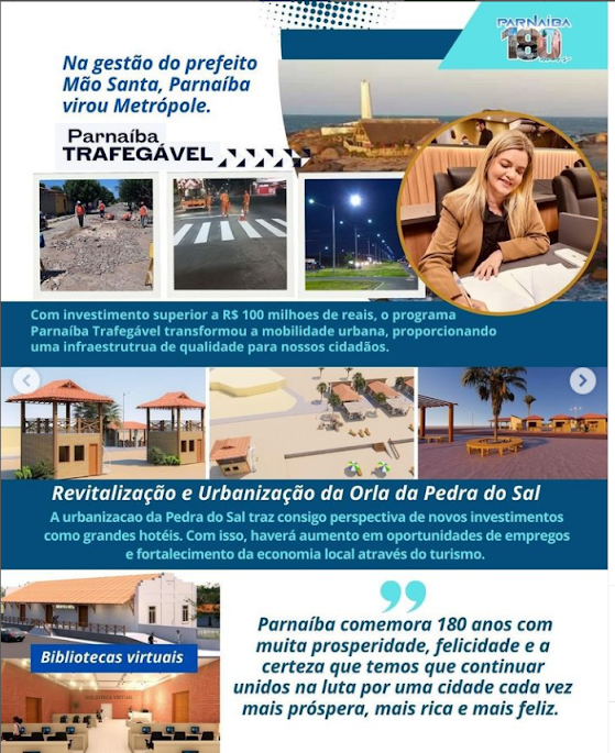 A programação de comemoração dos 180 anos de Parnaíba contou com a inauguração de centenas de obras e visitas a projetos em execução, demonstrando claramente que o trabalho não para em nossa cidade. O prefeito Mão Santa, juntamente com a deputada estadual Gracinha Mão Santa, presenteia Parnaíba com obras importantes, shows com artistas locais e nacionais que fomentam o turismo, geram empregos e fortalecem a economia local.Essas ações incentivam o turismo, o esporte, a educação, o lazer, a infraestrutura, a iluminação pública, e incluem programas como o mutirão de catarata e a intensificação do atendimento de saúde bucal. A saúde é levada diretamente aos bairros com a